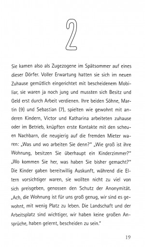 “Raus aus der Enge der Städte, hinaus aufs Land!”, das wünschen sich immer mehr Menschen. Beschaulichkeit, Übersichtlichkeit, Naturnähe, intakte Gemeinschaft - Schlagwörter, mit denen oft für ein Leben auf dem Land geworben wird.Victor und Katharina mit ihren Söhnen Martin und Sebastian ziehen als Familie auf ein Dorf. Als Fremde müssen sie in der neuen Umgebung erst ankommen. Ihre Erfahrungen sind gespalten: Offenheit und Freundlichkeit, aber auch skeptische Distanz begegnen ihnen. Als sich eines Morgens die Nachricht vom Tod der Dorfbewohnerin Maria M. verbreitet, wollen die Neuankömmlinge die Hintergründe aufarbeiten. Das scheinbar stabile Eis bekommt plötzlich Risse.